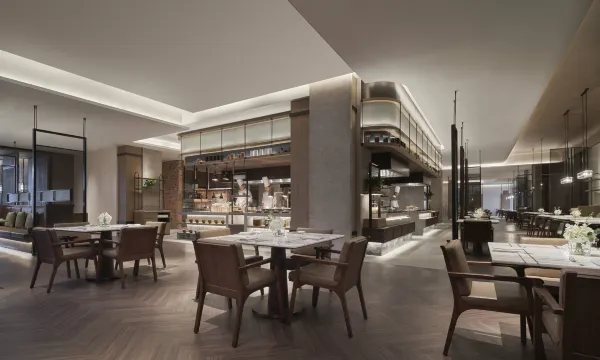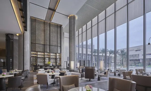 推窗即拥东湖潋滟,270°全景落地窗将湖海晨昏尽收眼底。晨光中,高端风筒柔风拂发,夜枕万豪特制床品,柔光伴眠至破晓。细节如诗:DURAVIT卫浴流转冷冽光泽,蓝牙时钟低吟爵士夜曲,早餐台现做弹嫩鱼丸与咸鲜面线糊唤醒味蕾。26楼“露芽台”茶室以岩茶邀人静坐,湖海在茶烟中相映成趣。