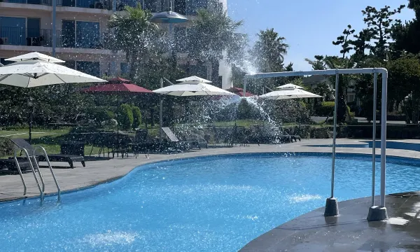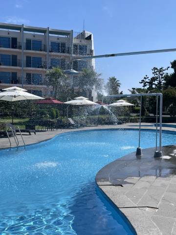 服务态度很好,整体也很安静,酒店楼下有自助的24小时便利店,房间有电磁炉和冰箱,基本住的都是带孩子来度假的韩国家庭。孩子很喜欢泳池,每天都要去玩水。离狭才浴场有一两公里距离,走路过去得半小时,打车的话25块钱左右。 阳台比较老旧。