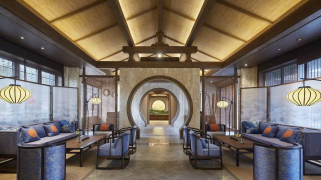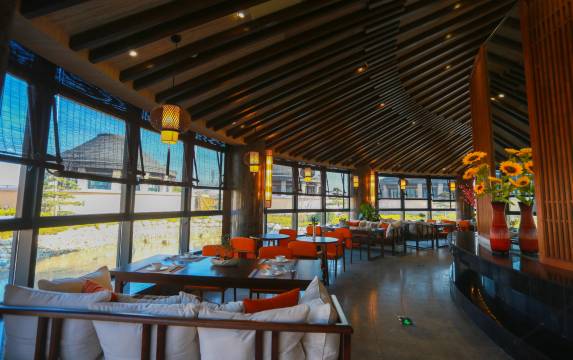 天台山温泉水采自天台山地下水源,水质呈弱碱性,富含多种有益人体健康的矿物质成分,能明显改善皮肤血液循环,增强新陈代谢和抗病能力。可软化皮肤,浴后会感到皮肤光滑柔软,清爽舒适。客栈依山而建,台阶式的古部落的文化外观,以内外三层圆形结构,象征太阳光辉普照大地的形象。客栈根据《史记.太史公记载》“夫阴阳四时、八位、十二度、二十四节各有教令”打造,把太阳文化和时辰与节气相结合。从内到外共分三层,最内层是360度圆形全日观景餐厅,能够满足客人自助以及点餐需要。
