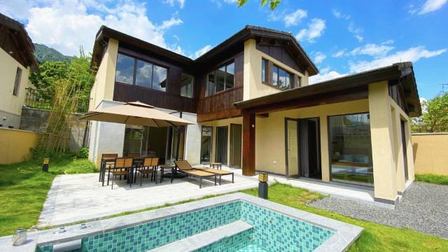 青山相伴,绿水环绕,侧耳倾听有虫鸣鸟叫,季节在眼眸中流淌而过,美好在这片大地自由生长,坐在别墅眺望远山仿佛置身于世外桃源一般。白天与友人品茗畅谈,一同欣赏这秀美山景,拍照打卡,夜晚赏月观星,尽享这份难得的静谧时光,回归山野。房间里家具、家电配置齐全,每一户都有独立泡池,一户一汤,尽享富含20多种矿物质及微量元素。