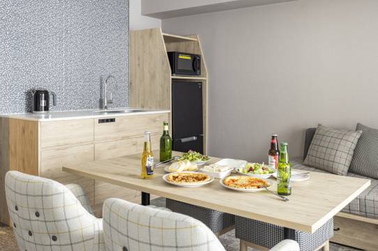 酒店坐落在安静区域,房间内有洗烘一体机,冰箱,微波炉……两个行李箱打开也无难度……很有家的感觉