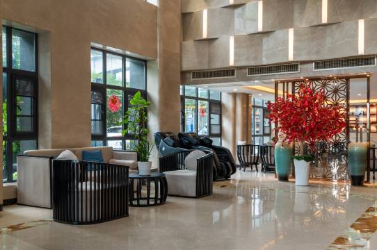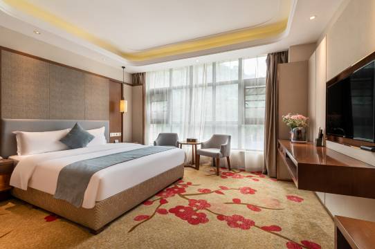 酒店是一家高端商务及会议型酒店,酒店坐落于贵阳市乌当区新添大道北段云锦路118号(万象国际温泉酒店旁),毗邻贵阳市中心,交通方便快捷,距离机场车程20分钟,距离国际会议中心30分钟车程。周围有大型商场,美食广场,游玩景点,打车方便,是商务旅游的不二首选。酒店还配备有3个会议室,能承接各种大型会议,大会议室能同时容纳200人,同时配备一个大型宴会厅,能够承接商业汇演,年会,婚宴等各种大型节目,而且客房类型众多,兼有大床房,双床房,亲子房,套房等不同类型的房型,能满足各种顾客的需求,房间设施一应俱全,安静舒适,为您带来高端典雅的旅途享受。