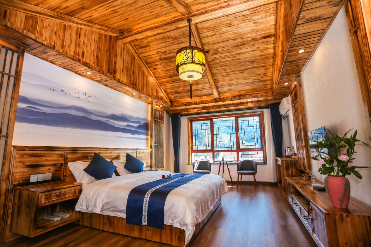 【住宿环境】民宿的内部装饰主要采用木质装饰,展现出自然的温暖和质朴的美感,每个房间都注重细节,配备了舒适的家具和现代化的设施设备;阳光撒入窗内使房间温馨明亮,窗外是高耸的山如瑰丽的玉峰挺立;庭院简洁宽敞,院子里木质小亭子和秋千供人休闲放松。