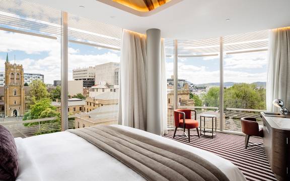 欢迎莅临下榻备受认可的霍巴特中央商务区塔斯曼酒店,便利探索塔斯马尼亚自然风光、非凡美食和创意宝藏。我们在澳大利亚率先设立的豪华精选酒店坐落在霍巴特海滨区,背靠库纳尼/威灵顿山,靠近霍巴特中央商务区、风景如画的德文特港、MONA渡轮码头以及标志性的萨拉曼卡广场和Battery Point社区。塔斯曼酒店建筑设计低调而优雅,以1840年代的乔治亚传统为序曲,历经1940年代的装饰艺术影响和2020年代的现代化扩展,为您演奏一曲建筑交响乐。质朴的砂岩与玻璃围护的现代建筑棱柱形成鲜明对比。