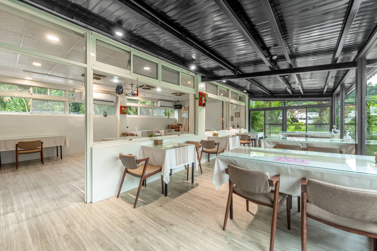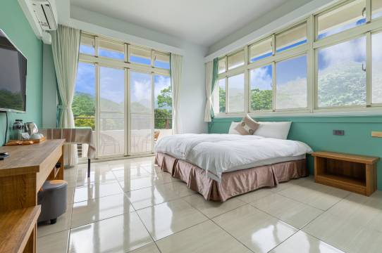 老板服务很好、房间空间很大、有饮水机跟冰箱可以自助使用、也可以借用厨房加热、交谊厅也很舒适、门口停车也很方便!