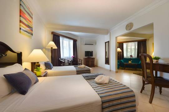 这家酒店地理位置优越,就在一家五星级酒店旁边,但价格却亲民得多。我强烈推荐选择海景房,体验感最佳。房间位置便利,离泳池和海滩都很近。不过,海景房只提供一张特大号床,适合两人入住,但你也可以轻松加床或额外住客,非常灵活。对于带着父母旅行的人来说,入住体验非常省心——停车很方便。酒店对孩子也很友好,是家庭出游的绝佳选择。总的来说,这里住宿舒适便捷,景色宜人。强烈推荐!