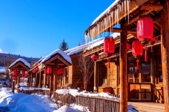 整个酒店是东北风情的院落,都是平房,没有楼房,从酒店大门开始,灯笼,栈楼,堆满雪的屋顶,浓浓的过年氛围。有阳光和下雪天,酒店院落拍出来都很美。