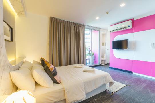 房间在四楼,只有楼梯。吸烟可以在阳台。入住时热水器坏了,但他们晚上修好了。洗衣服务是1公斤120泰铢(按重量计价),白天送去,晚上就熨烫好送回来了。酒店靠近夜生活场所娜娜广场。