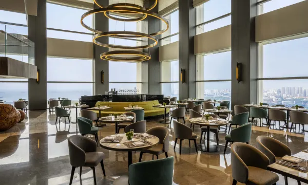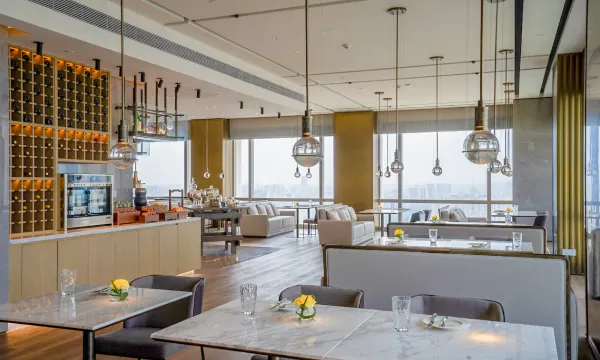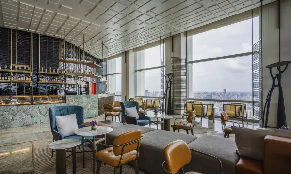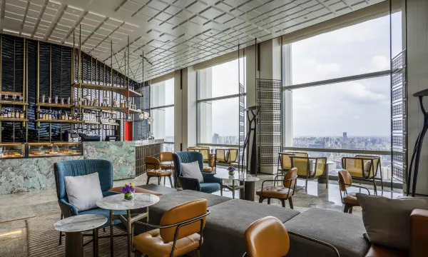 酒店大堂在35楼,地下车库入口第一次来不是很好找,如有更明确的标识会好很多。一楼大堂空旷,除了礼宾台什么都没有,一张椅子都没有,不是很方便。35楼大堂也很空旷,但该有的都有了。房间升级了,很大,设施齐全,也很干净。窗帘不行,罗马帘都有点坏了,遮光帘已经脱框,无法严密遮光。位置很好,对面就是万绿园,叫车也很方便。总体满意。