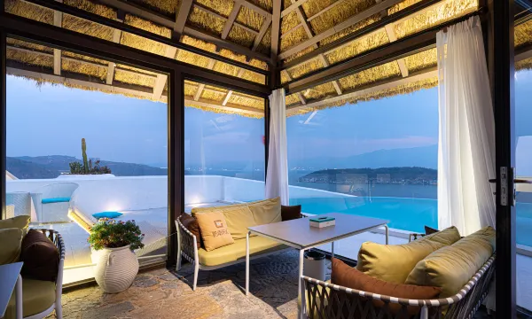 💡设施:设施很齐全,有冰箱和保险柜、沙发,庭院也有很棒的躺椅和喝茶的双人桌。部分房间室内有恒温泳池,有的泳池在庭院里