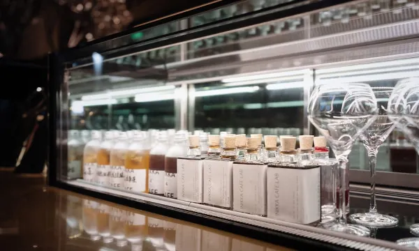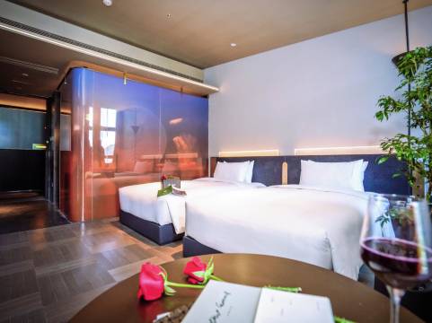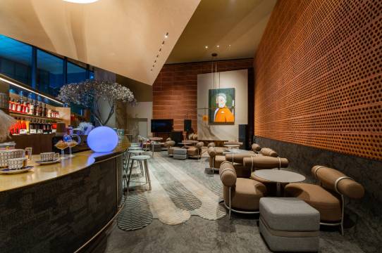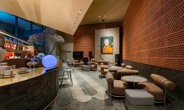 酒店的设计新颖,现在摩登时尚风格,结合先锋的科技与艺术的美学,将空间的多变性演绎得淋漓尽致。从功能到美学的延展,最终呈现于眼前大厅整体装潢为复古红棕色,粗粝的空心砖墙面和金属质感的银树相辉映,白天是文艺安静的咖啡厅,夜幕降临后化身神秘清吧。日啡夜酒 也是咖啡与酒精的碰撞。