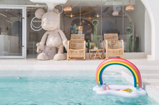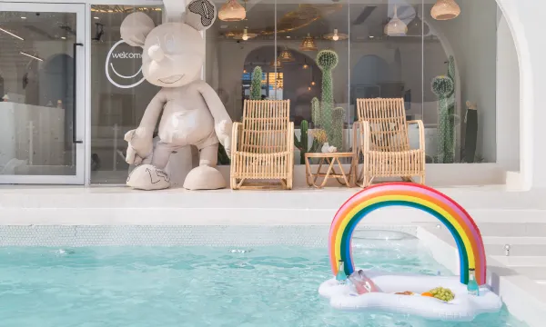 环境:很干净,即使前一天刚刚经历过台风,但是也很干净,整个民宿都是发光的,我是晚上到的,非常好找,过桥往前走就能看到他家经典的米奇头门!前面有泳池,后面有院子,院子里还有小秋千。前台还有两个可爱的大猫子,还有海洋球池~房间是ins风~整体都是奶白色系的,很温馨干净~