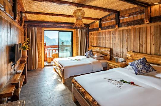 设施:房间空间比预期更惊喜,双床布局足够一家四口舒适入住,最爱的是自带的阳台——推窗就是错落有致的苗寨吊脚楼,到了夜晚,对岸万家灯火次第亮起,暖黄的光映着黑瓦,像把星星撒在了古镇里,氛围感直接拉满。