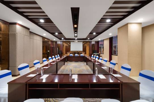 酒店的会议室装修风格简单大方,配套设施齐全先进,可容纳20--300人会议,会议台形任由您定!是您企业培训,商务会议的理想选择!