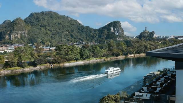 酒店位于桂林市安新南路,直面漓江,坐拥270°江景,毗邻城徽象鼻山,与桂林名山“穿山”“塔山”隔江相望,身后漓江桥如缎带纵贯向东。漓江边上的市中心位置,距离桂林火车站/万象城商圈、象鼻山/两江四湖景区、国际会展中心、高新万达商圈仅需10-15分钟车程,驱车前往两江国际机场约45分钟车程。