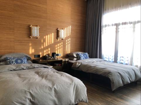中式禅式风格,一家四口选的3米榻榻米,足够睡,看了一眼朋友订的两张1.2米拼一起的房型,也不错,都适合四口之家,三楼是天台,可以观星赏月,吃饭选择门口的三合泰饭店哦,好吃!不过暖泉古镇的商业开发比较落后,里面很多村民住,还有很多落魄的房屋,晚上古镇里灯光不足,有点不好。