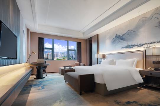 酒店开业不久,位于贺州市中心,房间很大,也很干净,前台还给我们免费升级了山景湖景房。