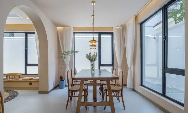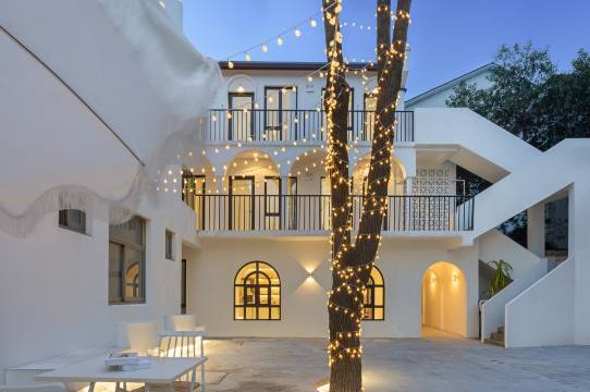 遇见礼白,惊艳时光。礼即致敬,白即简约。民宿就是想为顾客打造最纯净的时光。本民宿位于绍兴延安路未蓝文创园区10号楼,民宿整体为摩洛哥风格。颜色以白色为主,视觉感觉简约大气。白色立柱和黑色栏杆,映衬出黑白分明的高级感。圆形拱门和方形落地窗,为住户营造出浪漫的氛围。