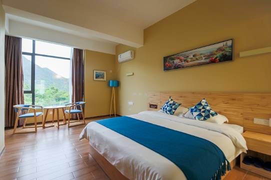 老板特别好,服务很奈斯,淡季见有小孩同行免费给我升级了卡通主题房,漫画特别喜欢,房间山景很美,离沙滩很近,走路几分钟就到了,酒店楼顶可以露天烧烤,有棋牌室和台球厅,设施很俱全,还免费停车,相当方便,虽然天气不太给力,但也是相当满意的一次旅行,超赞👍
