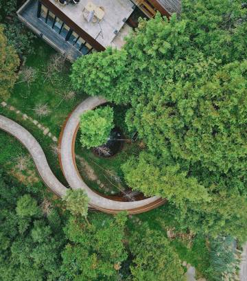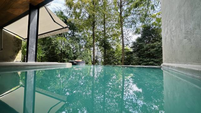 最惊喜的是房间里的私汤!超大落地窗正对着满山葱郁,泡在温热的汤池里,眼前是层叠的青山和摇曳的绿树!
