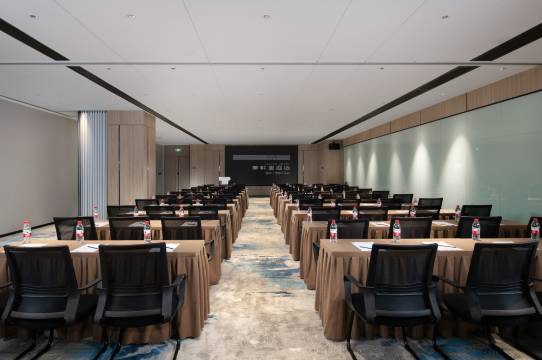 酒店楼高5层,酒店采用新中式设计,装修风格轻奢,别致,酒店集会议厅、餐厅、庭院及休闲娱乐等配套设施于一体。