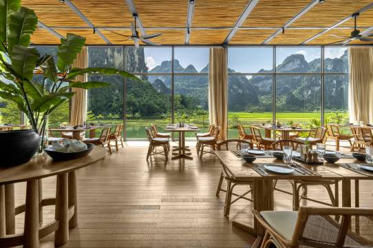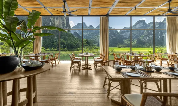 酒店依偎在明仕河畔,背倚喀斯特群峰,毗邻德天跨国瀑布,仿佛人间仙境。是中国首个丽世度假村,房间设超大落地窗,窗外山水美景一览无余。无边泳池融入山林,拍照超有氛围感。