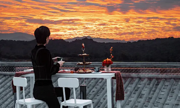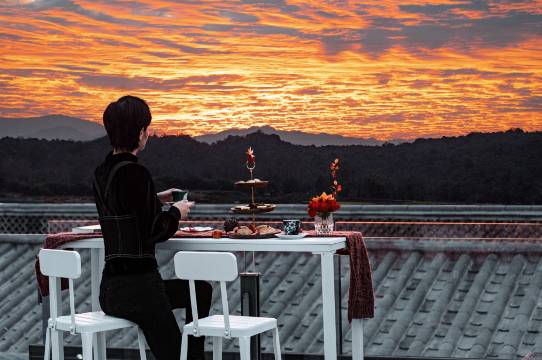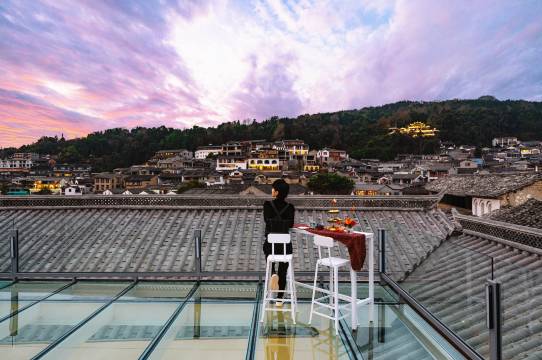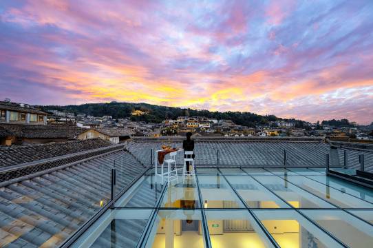 环境:离古镇出口很近,有车接送只需步行三四分钟,不需要上下台阶。天台看日落看蓝天视野都很不错。