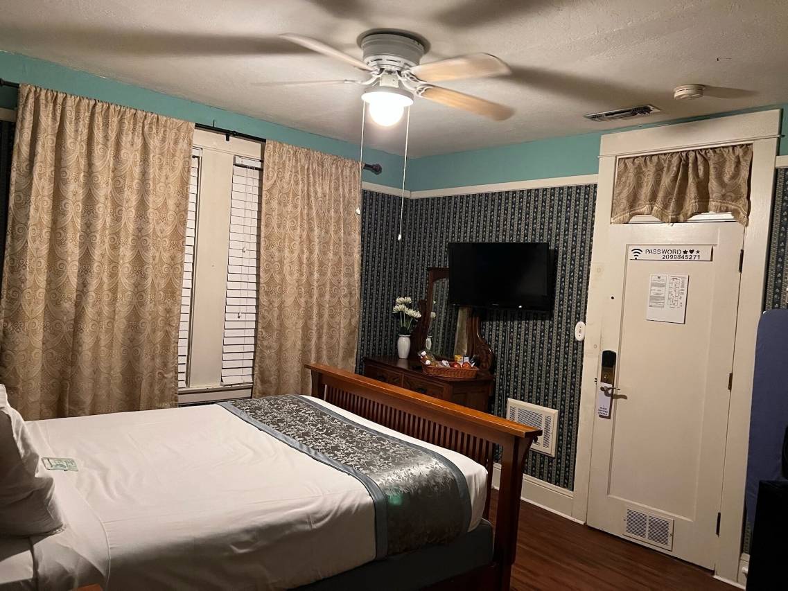 我们住的房间是一间独立的乡村小屋,里面有一张小双人床和一张沙发床。房间分为两部分,一部分是卧室区,另一部分是厨房。酒店位置绝佳,就在迷人的詹姆斯敦市中心。所有建筑都很有复古风格。明天的早餐篮是晚上送到的。房间不是很整洁,因为家具很旧,而且有宠物造成的划痕。