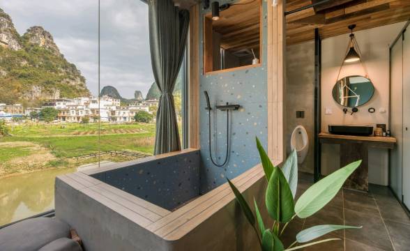 景区外面,距离景区很近,住在山水画里一样,景色很美,店家服务很好,入住和退房时都会主动帮忙搬行李,这点很暖心哦