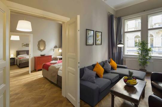 非常舒适的公寓,极其干净。我们预订了六人间,这是一套三卧室公寓。每个房间都配有一张双人床、一张大沙发、一张咖啡桌、一张带台灯的边桌和衣柜。餐厅厨房设施齐全,配备所有电器和餐具,还有一张可供六人用餐的餐桌。公寓散发着美丽的传统气息,巨大的窗户可以俯瞰图书馆。厨房铺设了传统的瓷砖,卧室则铺设了人字形木地板。公寓位于一楼,步行十分钟即可到达接待处,考虑到沿途会经过圣诞市场,这个距离并不算远。床铺非常舒适,床上用品也很干净。公寓设有一间浴室和一间卫生间,都非常干净。地理位置绝佳,步行即可到达所有景点。步行四分钟即可到达钟楼和圣诞市场,步行五分钟即可到达桥。公寓楼下就是商店和餐厅,非常方便。优步机场出租车服务非常快捷,可以直接送到门口。