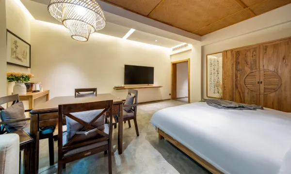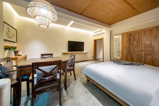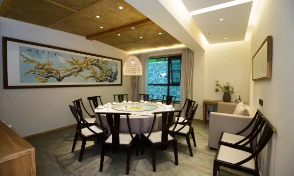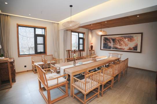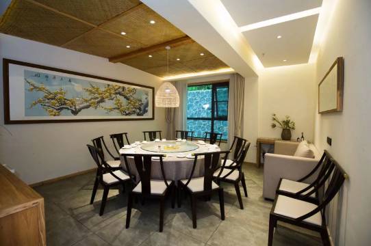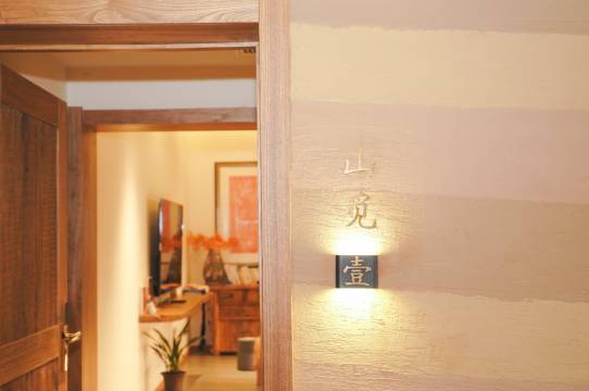 民宿上下共两层,有禅房及茶室,多动能会议室,餐厅有室内,也有室外露天观景用餐区。民宿共有18间客房,有三种房型,分别以“山沐”、“山觅”、“山寂”命名。客房面积都很大,布局中正,整体采光也很好,房间一派禅意中式风格,房间色调温暖,灯饰新意有趣。家居和摆设都是民宿主人精心挑选的,以中式器具装点,古朴古色,禅意而深具韵味,绿植鲜花书本为伴,到处氤氲着文化气息,让人瞬间能安静下来。