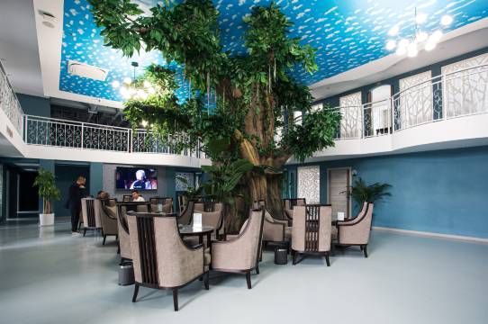 酒店总面积约1.14万平方米,酒店高48.5米,共11层,其中地下1层(70个免费车位),外部采用波斯米黄和深绿色的比利时镀膜钢化玻璃相间,形成独特的外形景观。