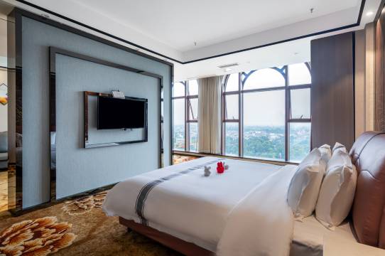 酒店全部客房均可鸟瞰市区景象,在夜幕中放眼远眺,都市夜景尽收眼底,令人心旷神怡。设备齐全是贵宾在彭州的理想居所,温馨舒适的客房配套以及体贴入微的个性化服务,让您在奔波而忙碌的商务活动后畅享一夜舒运的高品质睡眼。