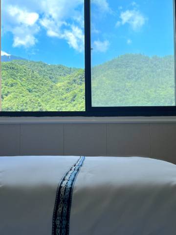 酒店位置正好在牛草山下,开车不堵车的话20多分钟就到了,停车方便有专属的车位,有自己的露天ktv,音箱效果很好,图一晚餐120元价格便宜,早餐10元一位。特点是标间的床是1.5米的双人床这个真不错,适合看日出或者看晚霞,老板人不错!