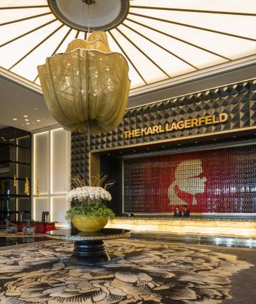 澳门卡尔拉格斐奢华酒店大楼由已故时尚巨匠 Karl Lagerfeld 亲自设计,以匠心独运的表现手法融汇中西美学及装饰艺术风格,展现他打破常规的设计哲学。在这栋由 Karl Lagerfeld 原创设计的酒店大楼中,所有细节皆由其亲自构思和挑选,以创新思潮与前卫美感演绎他卓尔超群的摇滚时尚风格,重新定义源自大师手笔的酒店设计典范。