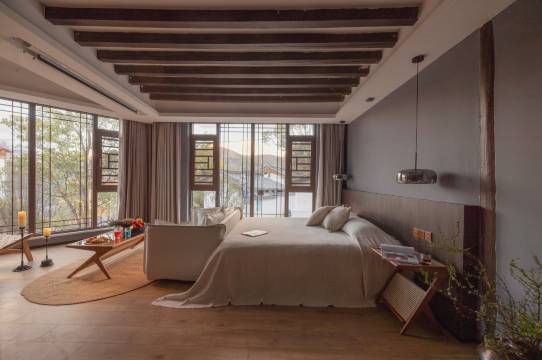 民宿主体建筑为木质结构的上下两层走马转角楼,沿袭了传统纳西民居特色-“四合五天井”建筑格局,设计古朴典雅。客栈设有十多间不同风格的房间,有特色复式loft房型,希望能满足您的住宿需求。客房内所有床上用品均由集团供应商为我们度身定做,盥洗用具全部采用高档的卫浴,卫生间干湿分离,电动窗帘,投影电视,独立专属无线WiFi,全屋智能客控;同时,所有客房都采用了价格不菲的空气泵作为热水循环系统,恒定水温,保证热水源源不断的供应,让顾客尽情享受洗浴的乐趣。