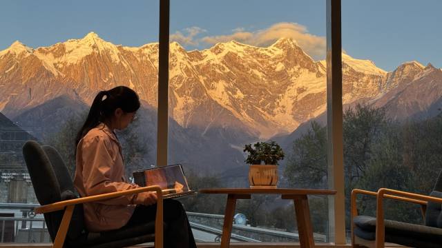 酒店楼顶有一个观景平台,无论是清晨的云雾缭绕,还是傍晚的霞光万丈,都能在房间内欣赏到绝美景色。尤其是春天桃花盛开的时候,雪山与粉色桃花交相辉映,简直像一幅画。