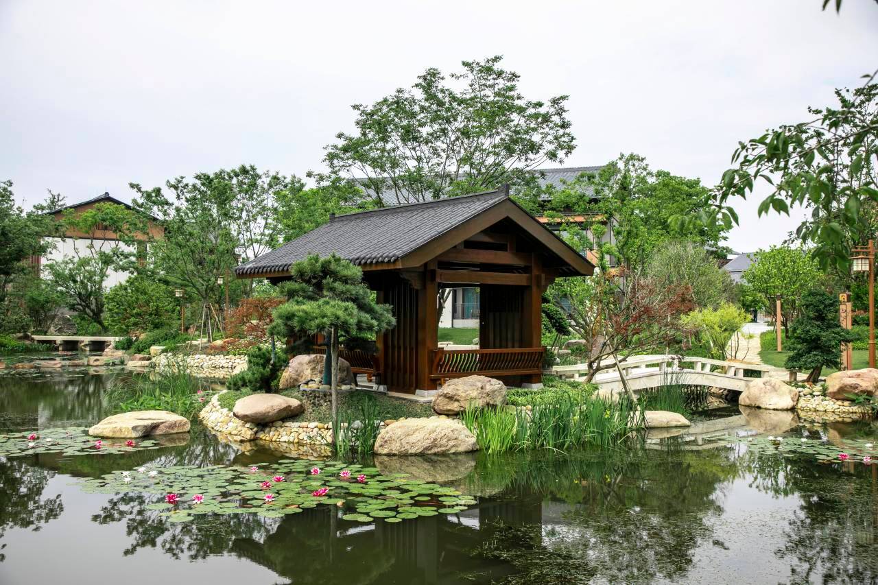 观音村内四季景色宜人,以涤心池为主要景观,通过合理布局营造浅草台阶休憩处,落尘坐禅亭,岩秀潭水景观,栈道串联各景点,形成可居可游的园林意境,宾客们能在自然中返璞归真,修身养性,体悟禅境。