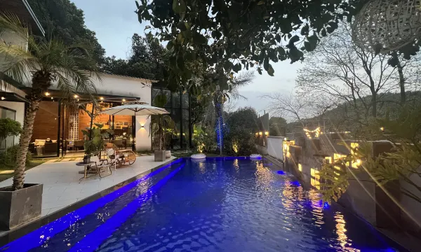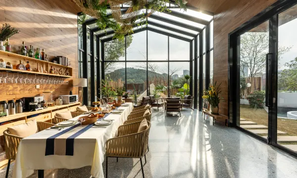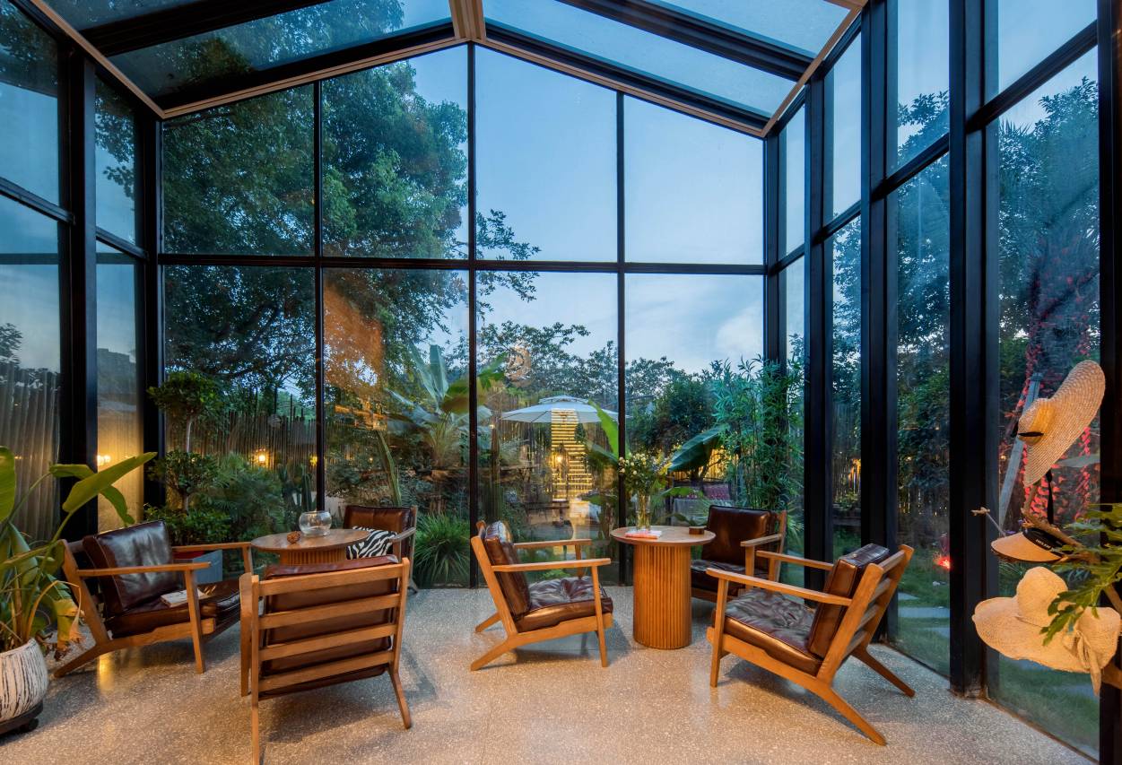 临山而筑的敬野舍民宿,这座清新庭院离繁华不远,却在车水马龙之外,独享一片山水相融的时光。推门而入,意外又惊喜。拾阶而上,清新绿植和仙人柱迎入的院子,泳池、棕桐树,遮阳伞,一幅赏心悦目的热带风情画卷,心中难免犹疑“这真的是在长沙吗?”泳池设置下沉空间,超美泳池下午茶是藏不住了!院子一角布置的白色帐篷注入春天活力,不同风格野餐布景,超级出片。一楼大厅是公共区间,也是咖啡和酒水空间。全景落地玻璃、设计感桌椅。绿植点缀,一隅一角,有不一样的细节,轻奢设计简约风,干净通澈,又彰显品质艺术感。落地窗无缝链接庭院的景致,“小院里的清池,洒进来的日光,无声无息,什么都不做,也觉得很美”玻璃公区和二楼露台,可以打造团建聚会室内和户外派对空间。民宿共有9间房,一楼泳池庭院房和二楼山景房,设施齐全,细节考究,希望带给每一个客人的是星级般的奢野享受。特别是一楼房间均设计了泡池,全面落地玻璃,超大庭院视野,泡池中放松身心,褪去疲惫,不必逃离城市,也能获得愉快的度假感受。山林之中,大树下巧妙打造森林掩眏的休闲空间,在这样的风景里,喝茶、咖啡还是品酒,各得兴味,甜蜜美好。