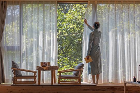 房间比较禅意,简约的装修,但是大落地窗让人就像直接睡在森林中。