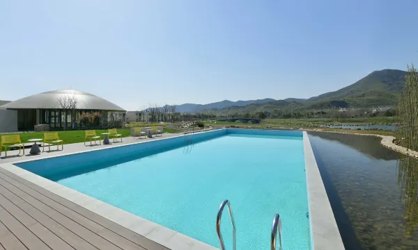 酒店坐落在群山之间,有一片超大的草坪🍃,还有溪水流淌,在山林氧吧里,感受自然的新鲜空气,对宠物友好,也有专属狗狗🐶的运动空间~