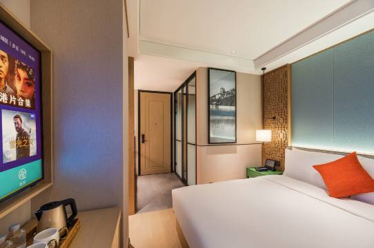 酒店客房全部采用人体感应系统,无需插卡取电开关,房间标配小度音响,可以通过小度音响控制房间灯光、窗帘、空调、电视等。床垫采用百年历史进口品牌金可儿,高品质全棉贡缎床品给您云端舒适睡眠。房间标配智能马桶,浴室采用法国有机精油香氛洗护用品(香凡罗蒂),热带雨林花洒分布密集雾状。