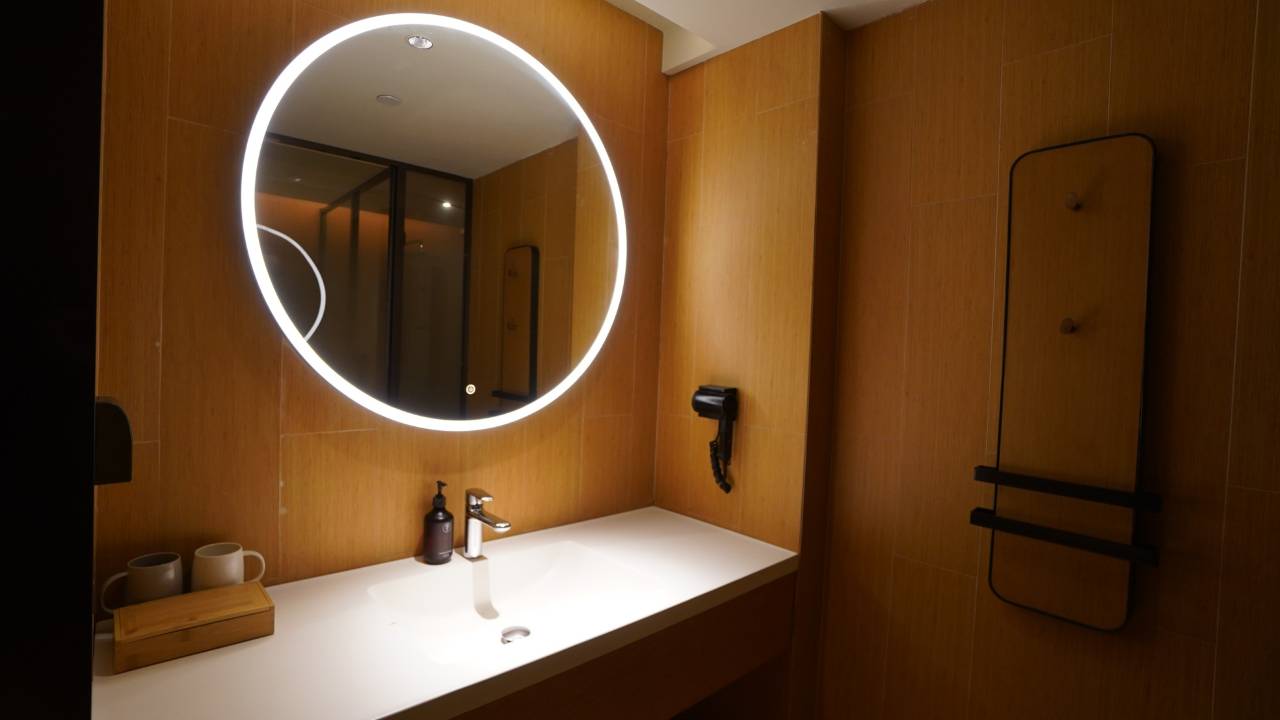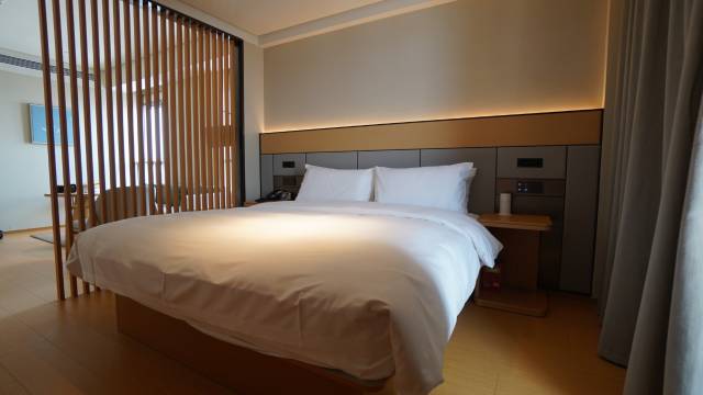 首先房间很大50多平,也很明亮房间设施齐全。床软硬适中再就是缺点不合理的地方床头没有灯的开关只有在门口有,还有就是洗浴淋浴喷头的固定位置居然坏了。需要进入全季大厅才可以进去