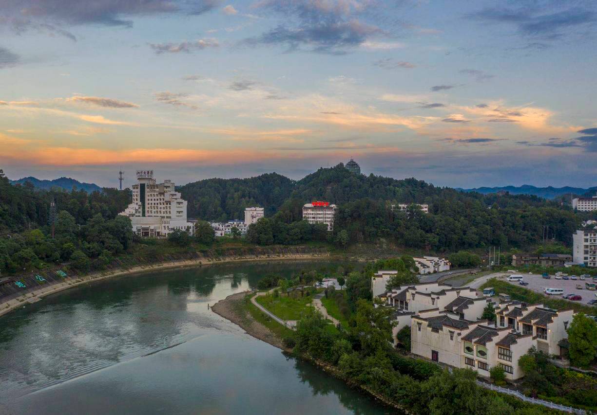 婺源江湾大酒店位于婺源县文博路西侧星江湾畔,酒店扼守县城制高点,为婺源地标性建筑。酒店依山傍水,周边绿意葱茏,2015年被列入饶河源自然保护区。入住酒店可饱览县城美景:清晨星江湾雾霭缥缈,如梦如幻;傍晚飞霞遮天,华灯璀璨,真正是望得见山,看得见水,记得住乡愁,颇受摄影爱好者青睐。