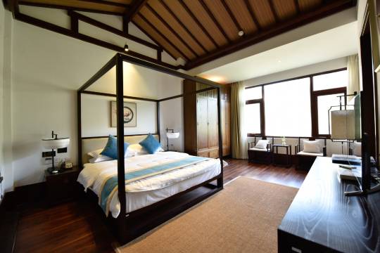 房间很大,是那种旧中式设计,比较有感觉,房间里的设施也很不错有高级感!服务也特别nice,早上起的很晚还贴心的留了早饭(很好吃,自然健康的农家味道)。周围环境也不错👍会想再去的!