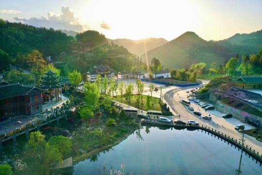 🌳一踏入这片绿意盎然的树林,就像穿越到了另一个世界。树木们手拉手,围成了一圈天然的围墙,守护着这座神秘的门楼。而门楼上,一排排红灯笼高高挂起,红绿交织,像是夜空中最亮的星✨,温暖又喜庆!