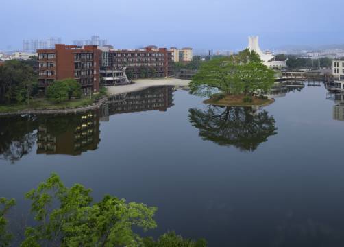 房间一拉开窗帘,孔雀湖的景色直接扑进眼里,夕阳下很美