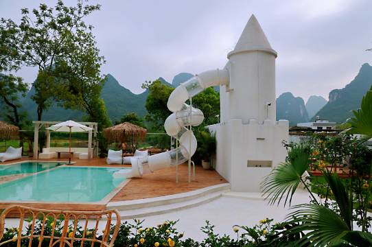看其他朋友推荐的亲子酒店,进小院就是一个巨大的泳池,还有羊驼和萌宠互动,房间布置很有特色,是上下两层岩洞的样子,靠海洋球攀爬架链接,我家两小只不要太爱,是下次来阳朔还想住的地方!