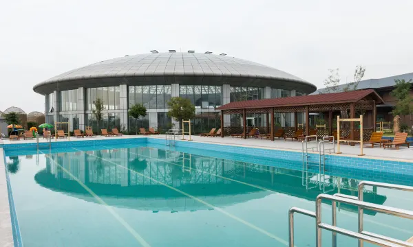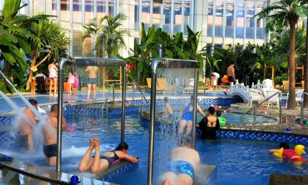 酒店占地面积300亩,圣豪温泉养生区,温泉出水温度高达64度,室内外泡池60多个,富含丰富的锶及氯、钠等30多种对人体有益的微量元素和矿物质。