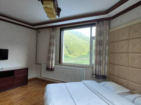 房间一张超大的坑,一家四口没一点压力。房内设施配套齐全,窗外就是五台山,远处青山苍柏,近处山坡草地上农家放养的牛群。